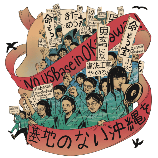 I wanted to capture the faces and the movement of the people protesting and just the emotions, anger, and just the feeling of this large group of people uniting against what is a very tragic incident. So in the image, I was inspired by actually an artist called Kim Jung Gi. His bold use of line work, especially in his art piece commemorating the 1919 Independence Movement of Korea, had this sea of people united together in this crowd formation. So in this image, I wanted to capture a similar crowd. But this time, the faces of Okinawa. [I] drew the images all black and white first, and then I colored the bodies blue. This blue represents the sea and its importance to the people, while using a warm color at the base to represent the land and its people, going back to Alexis talking about how important the sea and ocean is and is the beauty it holds. That’s why I wanted to use this color throughout all five images. In this image, I also include the silhouette of the victim actually on the left hand side. I wanted to keep a silhouette of her. Her tragic experience sparked a movement. However, to respect her privacy and personal autonomy, I chose to only illustrate a silhouette while keeping her presence at the foundation to this piece. The last important part about this piece are the signs and the signage for the main banner. I chose a direct phrase coined by the movements itself, “no US base in Okinawa” and its translation in Japanese. I also pulled the color red from the flag of Okinawa and decided to use this as another key color and focal point throughout all five pieces. The signage includes both verbiage from the 1995 protests and current day activism.