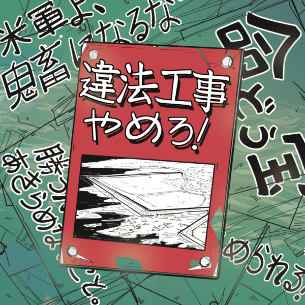 And then the central sign, its text is fairly straightforward: “Stop illegal construction.” In the image, I decided to include the picture of the Henoko base that I drew from the previous picture. This one is in black and white. And I think just having that contrast between that and the bright red center sign with the blue in the background pulling back in the sea and how it’s important to the people.