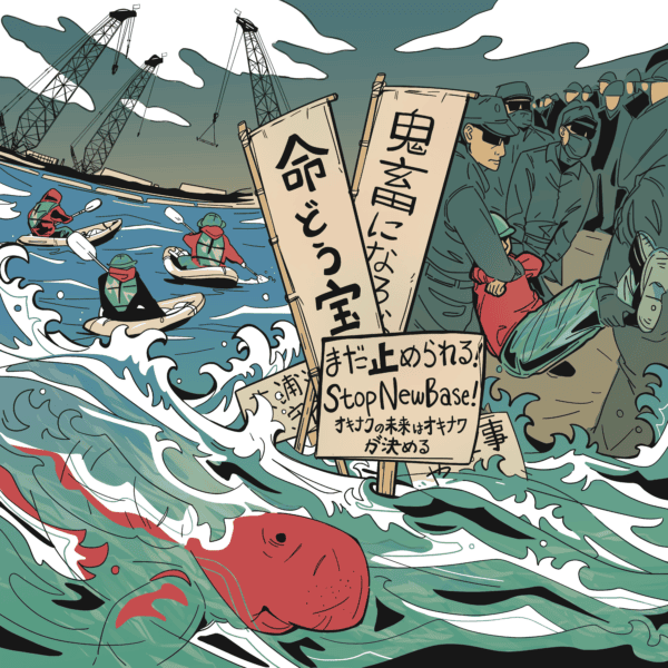 The dugong is a cousin of a manatee. It’s this formerly beautiful sea mammal, like an elephant in the ocean without a trunk, and it needs a very rare eelgrass ecosystem. Construction has already devastated this system. Unfortunately, it’s possible that the dugong has already been made extinct by this stage of the construction. I was actually trying to confirm that before we spoke today, but divers haven’t seen one for a while. Oura Bay was already a World Wildlife Fund site because of the rarity of the dugong. So if there is a symbol for “the life is the treasure” that is already lost, it’s this mammal. And that’s to me one of the interesting things about the activists involved is the complexity with which they have from the beginning used the word life. It’s not simply humans against tanks, it’s all forms of life living in Okinawa together versus further violence against their existence. And I was also really grateful that Kim put in the riot cops, because this is something that’s really not been well understood outside of Okinawa, is we’re really talking about octogenarian activists who chain themselves to US military bases and then get arrested and sometimes beaten up by the local riot cops. So this isn’t just happy citizens with guitars. It has moments of real violence. One of the more interesting forms of protest too has been the sea kayakers that go out and then they get chased by rather powerful motorized boats. And they’re really responsible in how they allow other protesters—you have to take a swim test, you have to actually know how to operate your craft—because they know they’re gonna get chased by either US military boats or Japanese police boats. And so on the one hand, probably the most gentle sea creature has been made to be extinct already, or is almost, versus well within the Japanese context, overt violence is very rare. And so when the protesters get roughed up in Okinawa, it needs to be better understood.