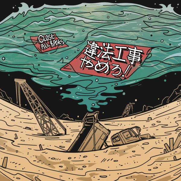 So the final panel, the topic sentence for the final panel was: “Now construction is stalled because the sediment in the bay is like mayonnaise, even as Japan’s Ministry of Defense declares.” So in this picture, I think the description “the sediment in the bay is like mayonnaise” really stood out to me, as I think it’s a very unique way to describe sand. So in this piece, I wanted to highlight that by illustrating the construction equipment sinking into its depths, really representing just the state of the base and its construction and the consequences of building it up on this foundation.