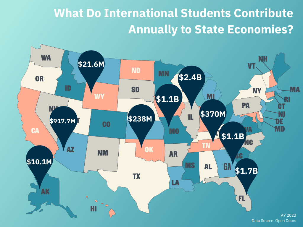• International students and scholars directly support state and national economies in the United States. In 2023, international students contributed $43.8 billion to the US economy, through tuition paid to host universities, travel expenses, housing expenses, food and other taxable sale items, and visa fees.*